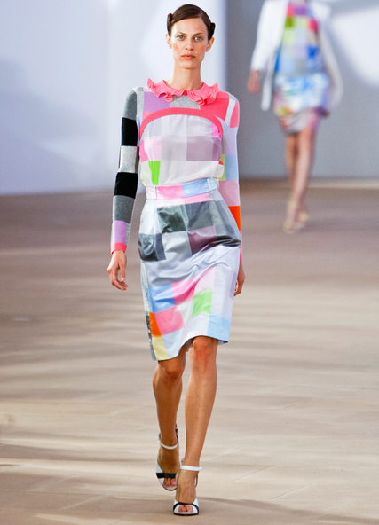 Preen's SS 2010 collection was apparently inspired by feminist novelist Virginia Woolf. It supposedly embodies the idea of women defying the expectations of society while appearing to obey the rules on the surface. Anyway.. bullshit aside, I think it's a great collection. With just enough nods to the 40s, 50s and 60sto keep you on your toes, plus unusual pairings of gelati colours and textures, this collection is a step away from Preen's usual masculinity.